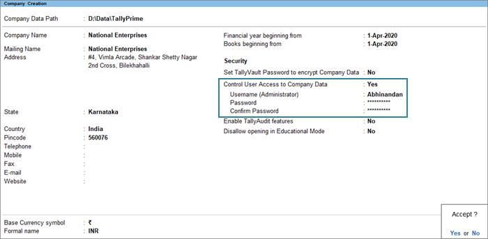 You can further protect your data by using a TallyVault password. All the information including your company name will be encrypted. Only authorised users will be able to access the company. However, if you forget the TallyVault password, you will permanently lose access to your company information.