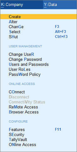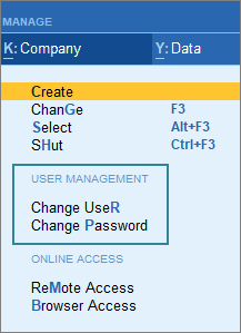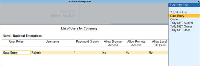 If more than one users access your company information, you can provide role-based security rights to these users. By default, two security levels are available in TallyPrime: owner and data entry operator. Users who have the credentials for the owner security level will have the rights to access all the data and set up security, create, and update user information, and so on. On the other hand, the data entry operator will have the rights to record the vouchers, view certain reports, and so on. When you access the company with the owner credentials, you can add more users, modify existing user credentials, remove users, alter the permissions for the different users in your company, and so on.