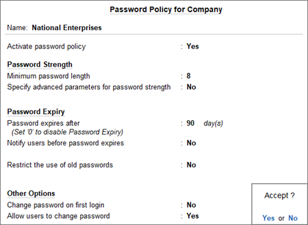 Using the Password Policy, you can activate additional options for the password, such as password strength, password expiry, and so on. Moreover, you can also enable certain users to change their own passwords.