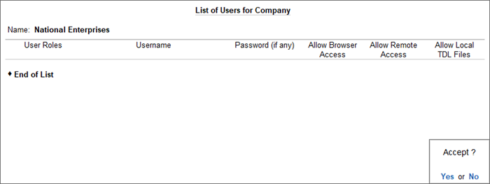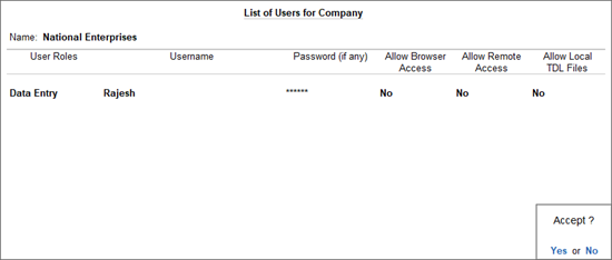 If you want to track which user has added, altered or deleted a transaction, or want certain users to have full permission to access the data, you will have to create a username and password for all these users, and assign the rights accordingly. For example, you can provide the data entry operator with voucher entry permissions only, and restrict the viewing of reports and recording of back-dated vouchers. For an accountant, you can provide all the data entry permissions, and provide access to certain reports only.