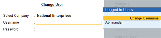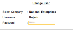 After the required users have been created in Users and Passwords (as shown in the previous section), the new user can now log in to the company. Let us consider that the new user is a data entry operator called Rajesh.