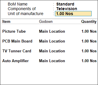 A Bill of Materials is a list of constituent items along with quantity details that can be allotted for the manufacture of a certain product, by-product or likewise. This facilitates immediate reduction in stock of the item automatically. This process of listing the items that make up another item is made possible in Tally by enabling the Bill of Materials Facility.