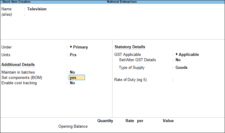 - Set Component (BOM): To create the component list required to manufacture the Finished goods enable this option to Yes and press Enter to view Stock Item Multi Components (M BOM) screen.