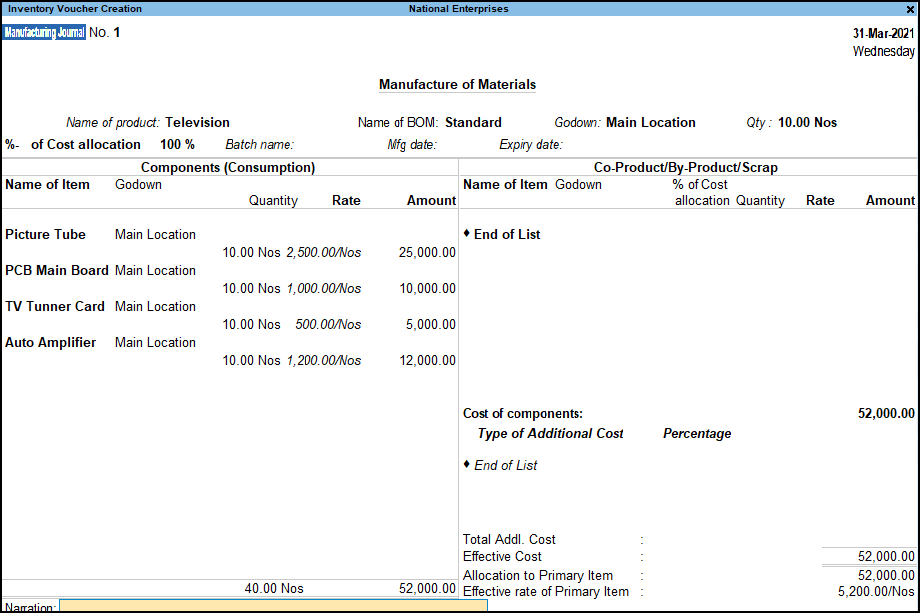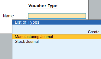 - Press Alt+G (Go To) > Create Voucher > press Alt+F7 (Manufacturing Journal).