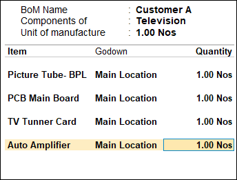 - Press Enter to save the Stock Item components for BOM – Customer A and to view Stock Item Multi Component screen.