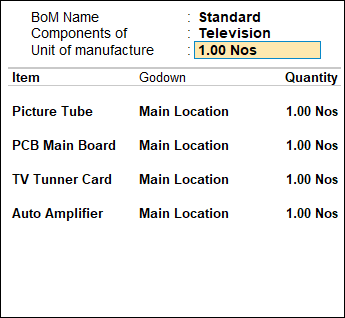 Note: In the above scenario for Stock item – Television we have created 2 BOM. Similarly you can create multiple BOM with different component list for the stock items.